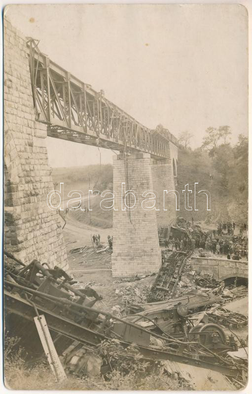 1931 Biatorbágy, Torbágy; Felrobbantott vasúti híd Matuska Szilveszter merénylete után, mozdony maradványok, vasúti katasztrófa / Blown up viaduct with the ruins of the train, railway disaster, trainwreck. Bátori Béla felvétele, photo (kopott sarkak / worn corners)