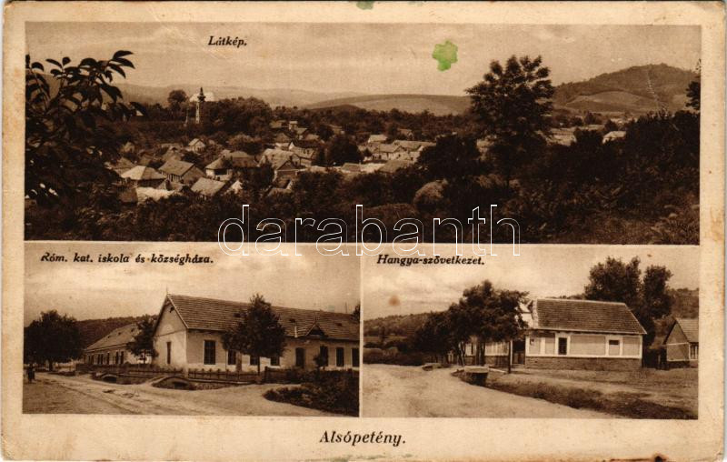 1935 Alsópetény, látkép, római katolikus iskola és községháza, Hangya ... https://www.darabanth.com/de/45-Gross-Auktion/45.1/Ansichtskarten/Ungarn~18763/1935-Alsopeteny-latkep-romai-katolikus-iskola-es-kozseghaza-Hangya-szovetkezet-uzlete-~II3434148