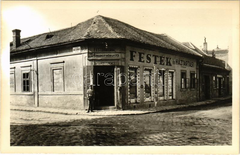 Budapest II. Margit körút 73. Zafourek Ferenc festékháruháza, üzlete, ... https://www.darabanth.com/de/45-Gross-Auktion/45.1/Ansichtskarten/Ungarn~18763/Budapest-II-Margit-korut-73-Zafourek-Ferenc-festekharuhaza-uzlete-Kis-Rokus-utca-photo-~II3422384