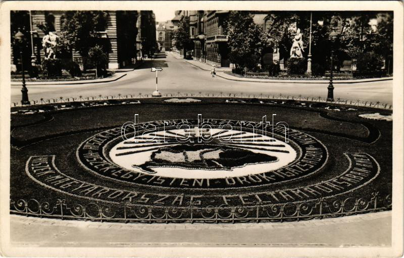 Beschreibung: Budapest V. Szabadság téri park részlet, irredenta virágágyás, villamos (EK)