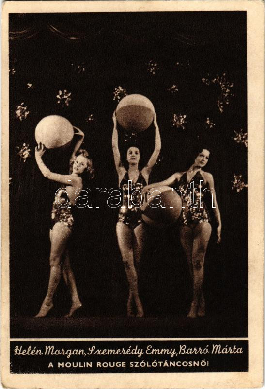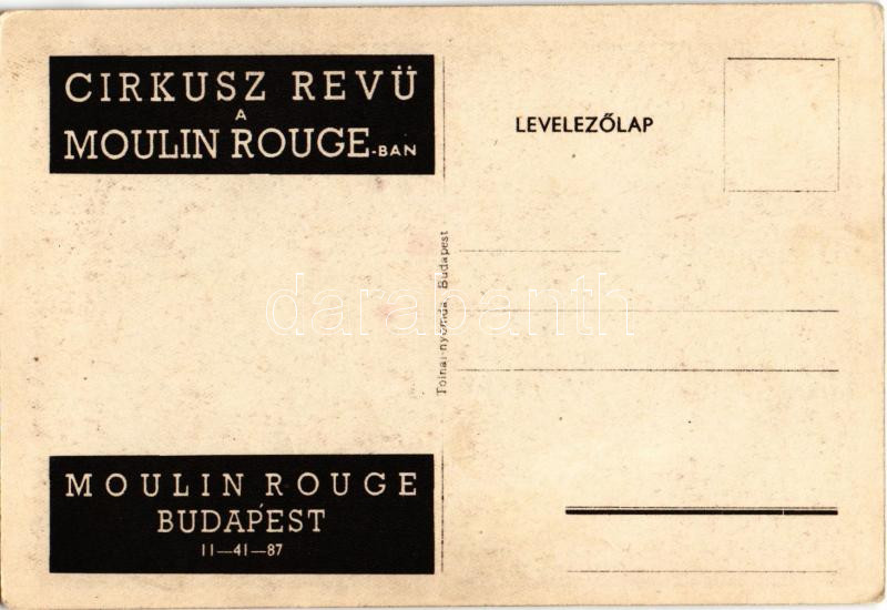 Beschreibung: Budapest VI. Moulin Rouge, Helén Morgan, Szemerédy Emmy, Barró Márta szólótáncosnők. Cirkusz Revü reklám a hátoldalon (EK)