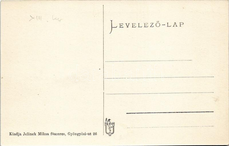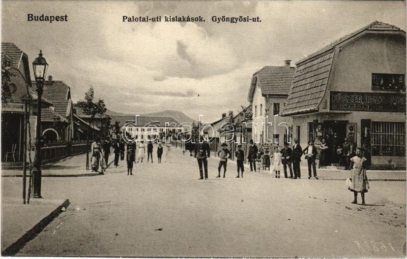 Beschreibung: Budapest XIII. Angyalföld, Palotai úti kislakások a Gyöngyösi úttal, Jelinek Miksa üzlete és saját kiadása