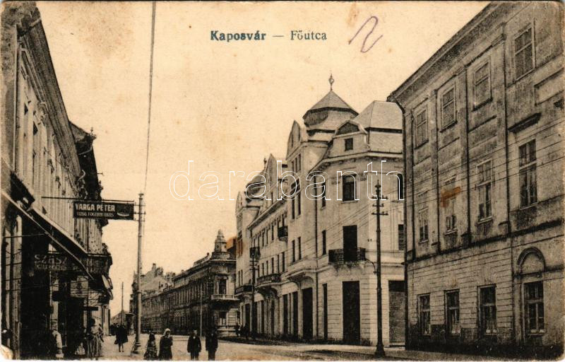 Kaposvár, Fő utca, Varga Péter, Szász üzlete (fl) https://www.darabanth.com/de/45-Gross-Auktion/45.1/Ansichtskarten/Ungarn~18763/Kaposvar-Fo-utca-Varga-Peter-Szasz-uzlete-fl~II3453467