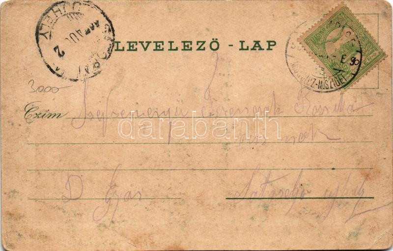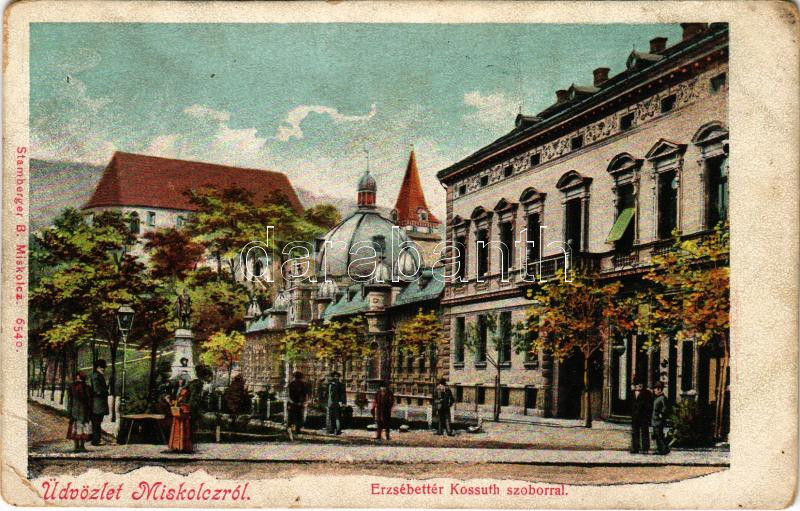 Miskolc, Erzsébet tér a Kossuth szoborral. Stamberger B. kiadása 6540. + "BUDAPEST - MISKOLCZ - M-SZIGET" vasúti mozgóposta bélyegző (kopott sarkak / worn corners)
