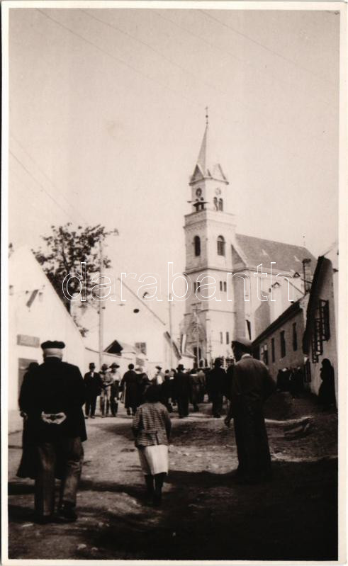 Beschreibung: Mór, Szent Kereszt templom a Vasút utca felől, utcai sokadalom. photo