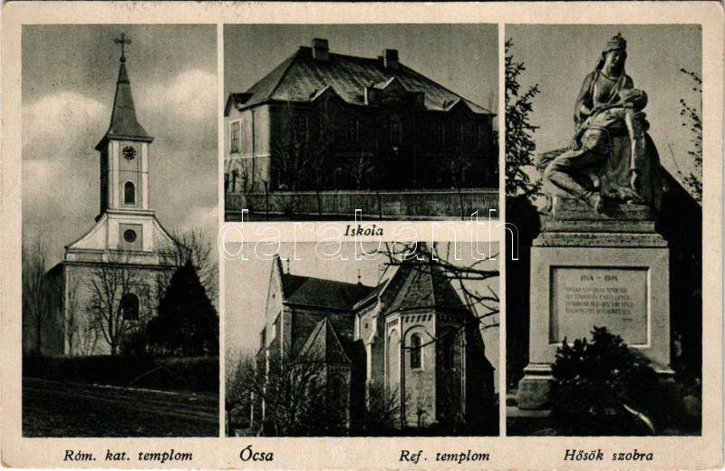 Beschreibung: Ócsa, Római katolikus templom, Iskola, Református templom, Hősök szobra, emlékmű. Náfrádi kiadása (EK)