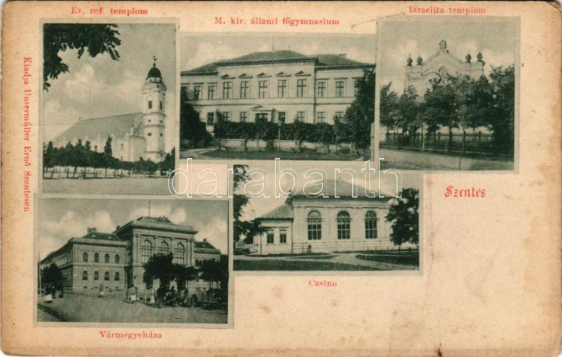Beschreibung: Szentes, Református templom, M. kir. állami főgimnázium, Izraelita templom, zsinagóga, Vármegyeháza, kaszinó. Untermüller Ernő kiadása (r)