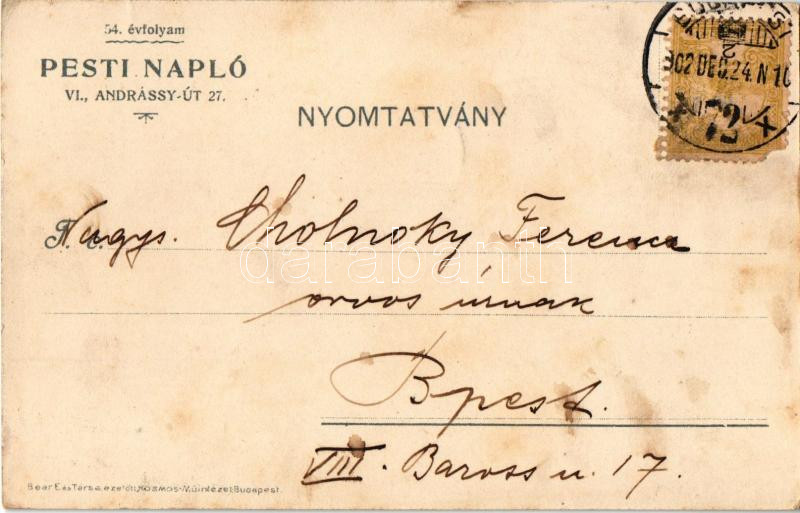 Beschreibung: 1902 Pesti Napló elÅ‘fizetés ajándék Zichy Mihály albummal. reklám. A képeslap cÃmzettje dr. Cholnoky Ferenc nÅ‘orvos / Hungarian newspaper advertisement. Beer E. és Társa azelÅ‘tt Kosmos Műintézet litho (EK)