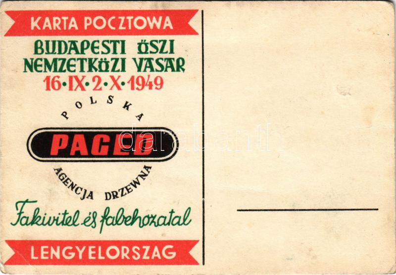 1949 Budapest Őszi Nemzetközi Vásár, Fakivitel és fabehozatal, Lengyel... https://www.darabanth.com/de/45-Gross-Auktion/45.1/Ansichtskarten/Werbungen~18848/1949-Budapest-Oszi-Nemzetkozi-Vasar-Fakivitel-es-fabehozatal-Lengyelorszag-Hungarian-and-P~II3449122