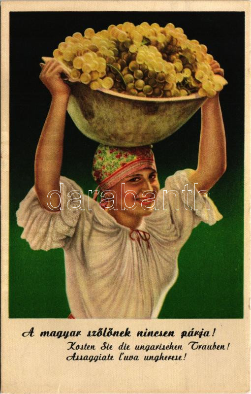A magyar szőlőnek nincsen párja. Magyar szőlő reklámja, folklór. Klösz György és Fia kiadása / Hungarian grape advertisement, agricultural propaganda, folklore