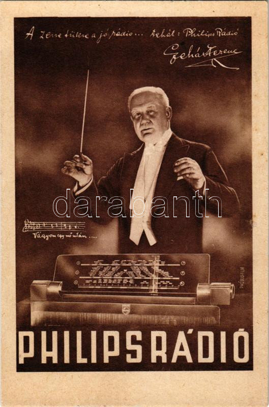 A zene tükre a jó rádió... tehát: Philips Rádió. Lehár Ferenc (1870-1948) zeneszerző, operettkomponista, karmester / Radio advertisement with Hungarian conductor