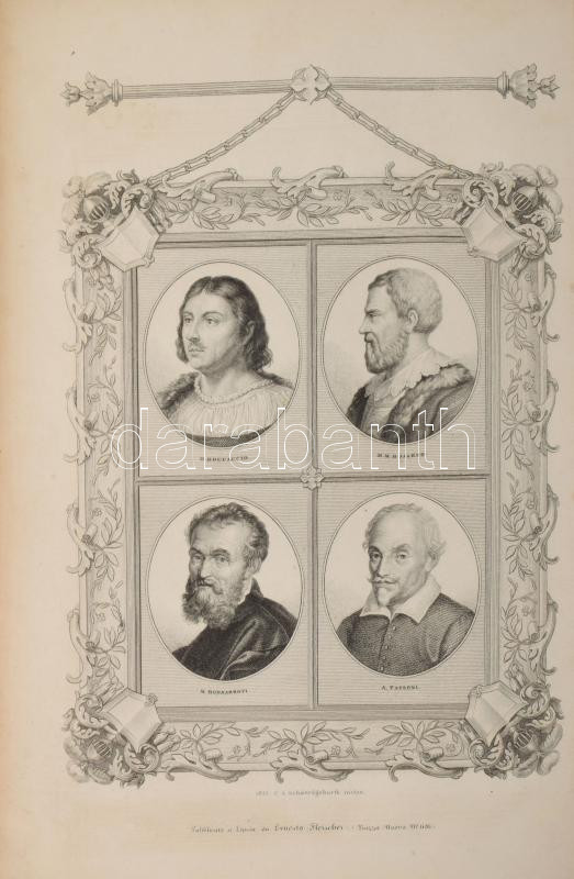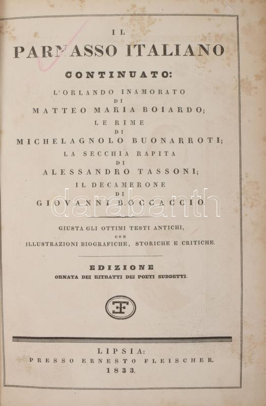 Il Parnasso Italiano continuato: L'Orlandi inamorato di Matteo Maria Boiardo; Le Rime di Michelagnolo Buonarroti; La Secchia Rapita di Alessandro Tassoni; il de Camerone di Giovanni Boccacio. Lipsia [Lipcse], 1833, Ernesto Fleischer, 1 (címkép) t. +2 (címlap) +XVI+296+2;+VI+36;+XXI+1+60;+LVI+260+6 p. Olasz nyelven. Korabeli kartonált papírkötés, kopott borítóval, sérült, részben hiányos gerinccel, foxing foltos lapokkal, nagyrészt felvágatlan lapokkal.