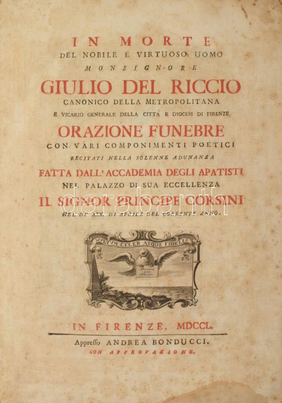 In morte del nobile e virtuoso uomo monsignore Giulio del Riccio canonico della metropolitana e vicario generale della citta e diocesi di Firenze Orazione Funebre con vari componimenti poetici recitati nella solenne adunanza Fatta dall'Accademia degli Apatisti nel palazzo di sua eccellenza Il Signor Principe Corsini nel di' XXX. di aprile del corrente anno.