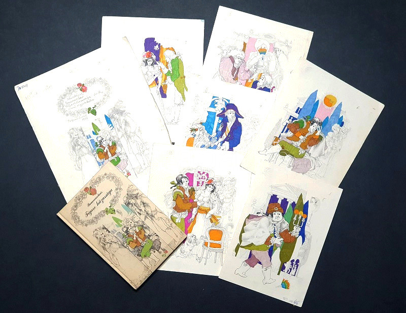 Színes borítóvázlata körül ismeretlen kéz által írt nyomdai megjegyzések, a borítóterv címfeliratozása alatt a művész saját kezű aláírása. A belső illusztrációkhoz készült színes vázlatok mindegyikén sorszámozás, jobb alsó sarkában érkeztetési bélyegzés és szerkesztőségi láttamozás, a borítóterv és két belsőillusztráció-terv verzóján szerkesztőségi bélyegzés, szerkesztőségi szignókkal, Lator László (1927-2023) költő, főszerkesztő és Gara György szerkesztő három-három láttamozó szignójával. A borítóterven apró gyűrődések, a kartonok verzóján illesztési nyomok. Grafika-gyűjteményünk emlékezetes bepillantást nyújt egy készülő kötet szerkesztési munkálataiba.