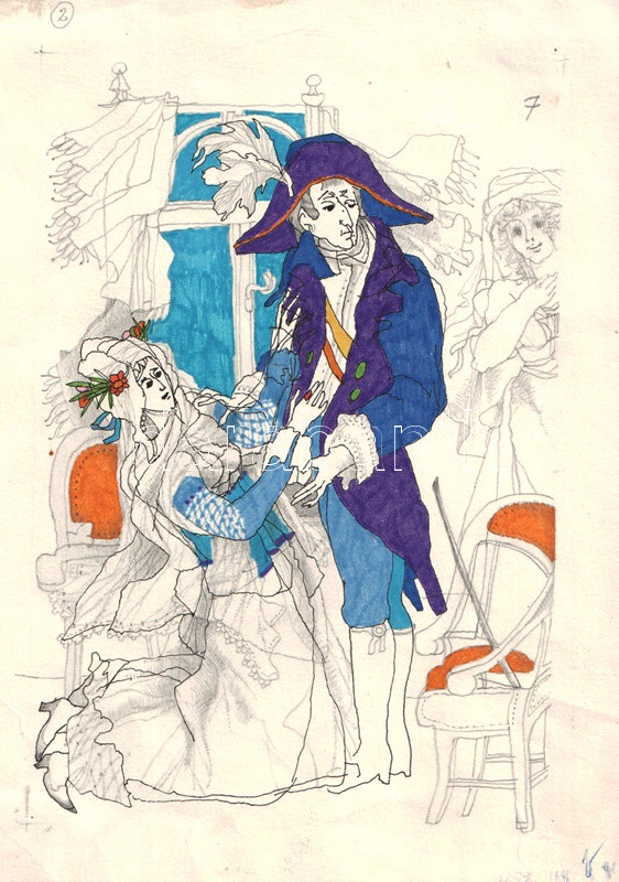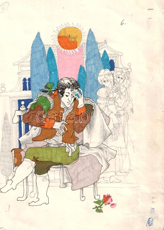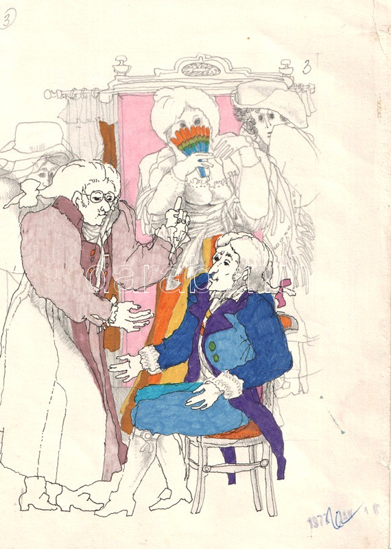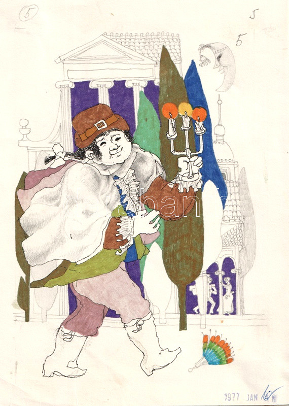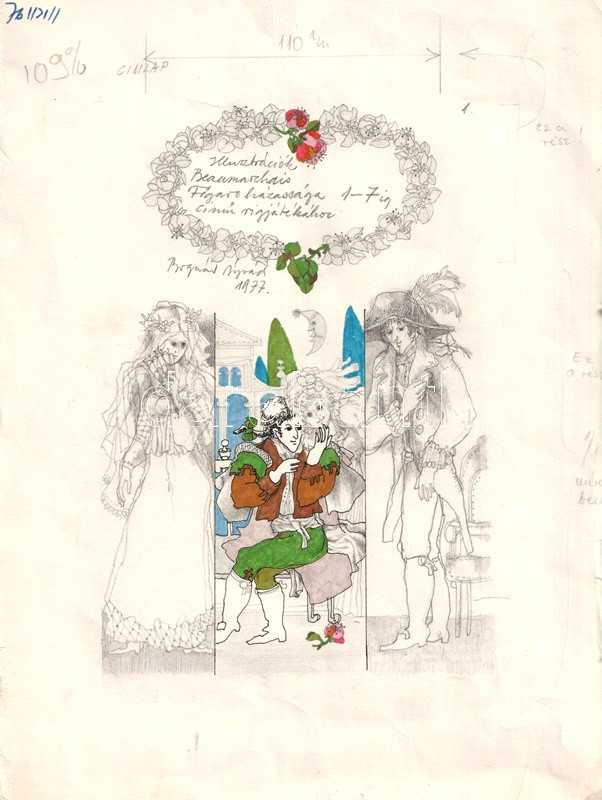 Kelt: Budapest, 1977 januárja. Hét illusztrált karton, vegyes technika: ceruza, tus, akvarell.