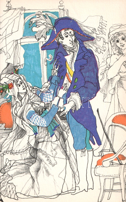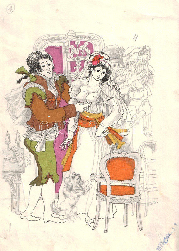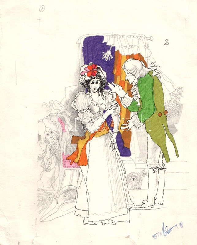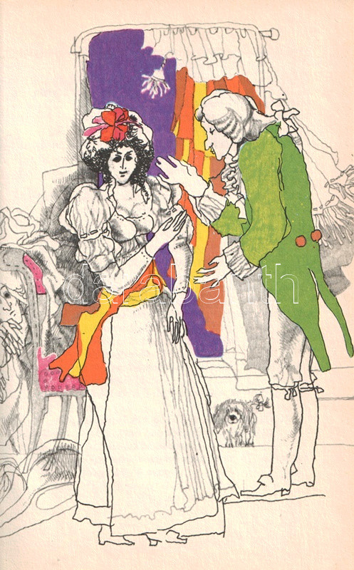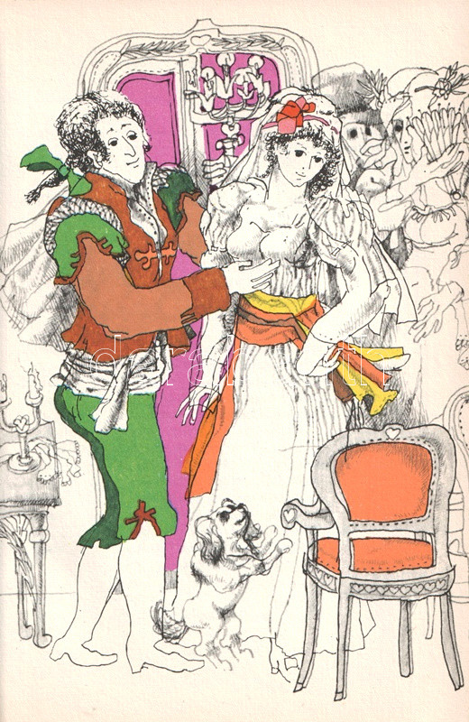 Bognár Árpád (1931-2004) Munkácsy-díjas grafikusművész hét színes, részben aláírt illusztrációja Beaumarchais "Figaro házassága, avagy egy bolond nap" című vígjátékénak képes kiadásához (Budapest, 1977, Magyar Helikon).