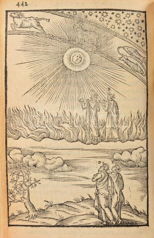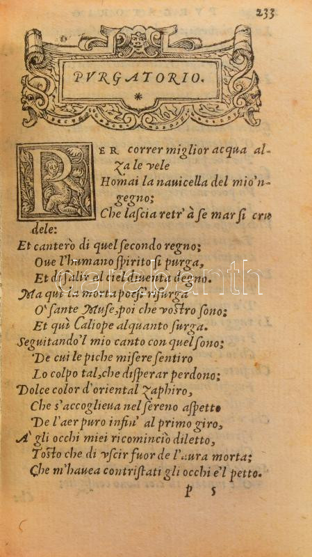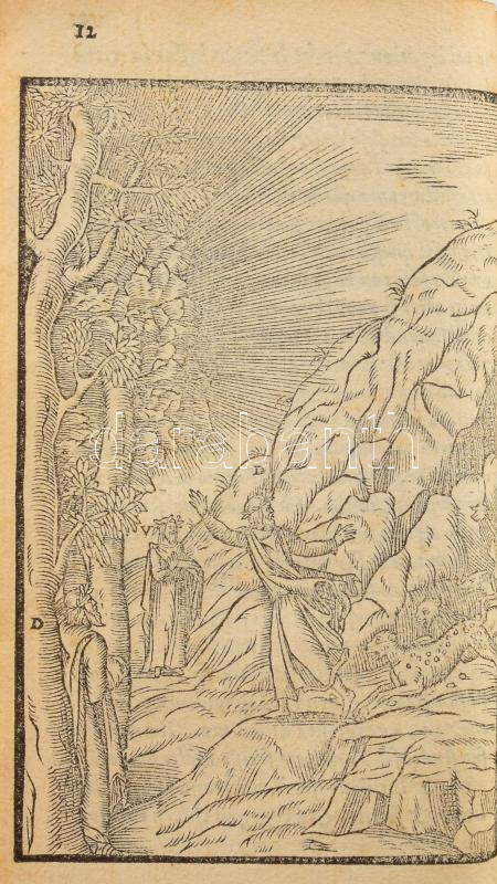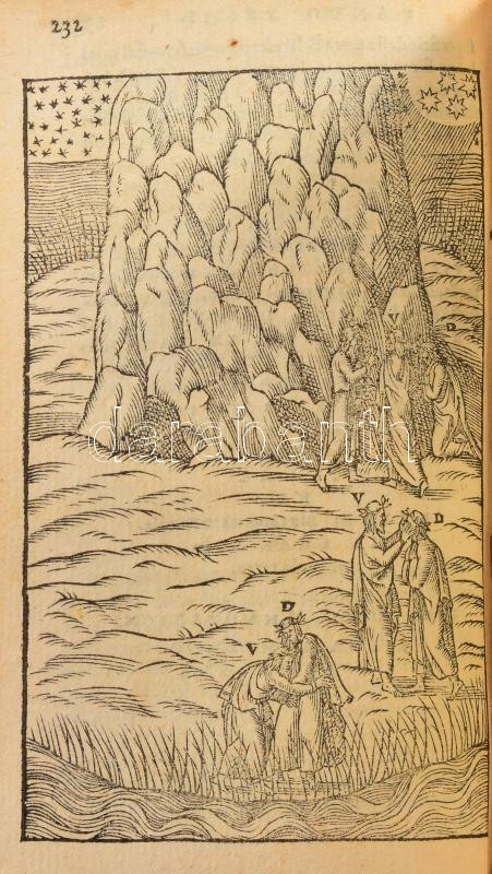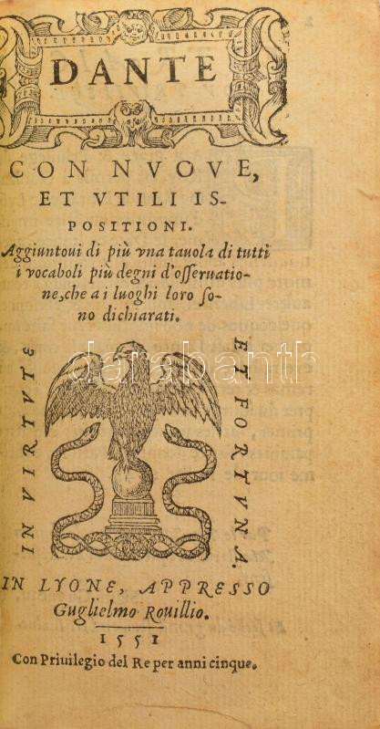 Dante, [Aligheri (1265-1321)]: Con Nuoue, et utili ispositioni. Lyone, 1551., Guglielmo, 1551, Guillaume Rouille, 644+12 p. Guillaume Rouille-féle "Isteni színjáték" kiadás első kiadása (1551), amit 20 évvel később követett a második kiadás (1571.) Három egészoldalas metszettel, valamint Dante arcképével illusztrált. Olasz nyelven. Aranyozott gerincű egészbőr-kötés, kopott borítóval, jó állapotban, 12x7,5x3 cm/
