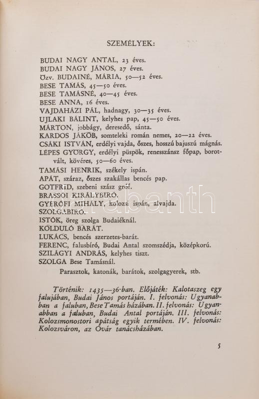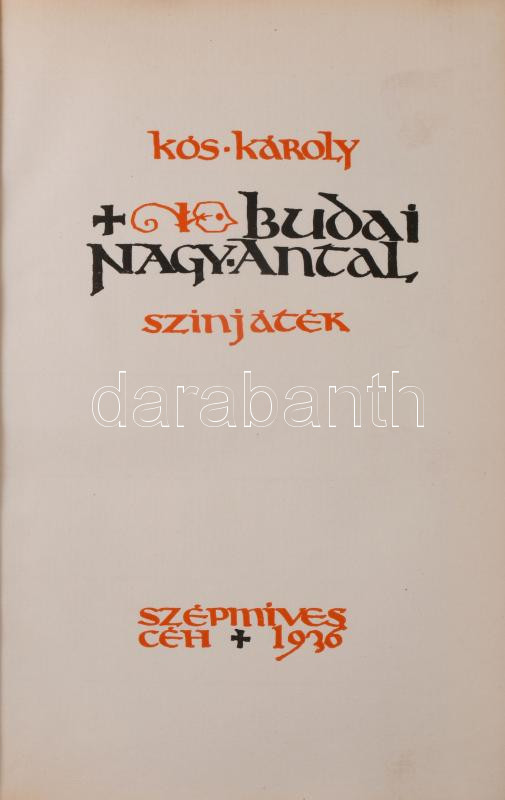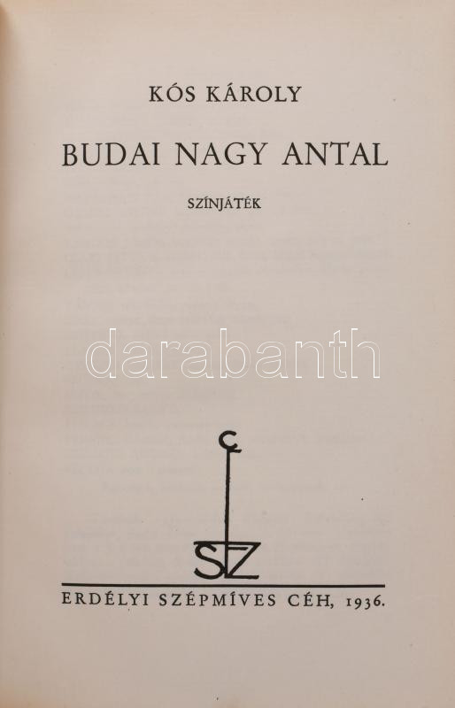 Kós Károly: Budai Nagy Antal. Színjáték. Erdélyi Szépmíves Céh 105. sz. kiadványa. Kolozsvár, 1936., Erdélyi Szépmíves Céh,(Minerva-ny.), 2 (díszcímlap)+147+1+IV (Erdélyi Szépmíves Céh tagjainak névsora) p. 1. kiadás. Számozott, 110. számú, előfizetők részére készült példány. Ex libris-szel, rajta Erdély címerével: "Ez a könyv az Erdélyi Szépmíves Céh tagja: Dr. Bányász István számára készült." Kiadói félpergamen-kötés, Rohonyi Antal-kötés, kissé kopott, részben fakult borítóval.