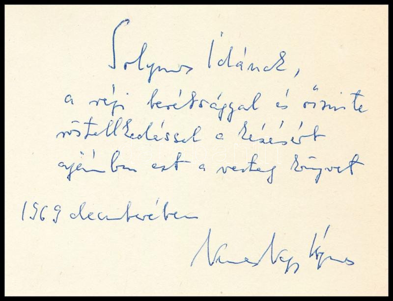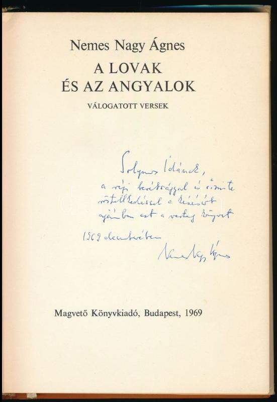 Nemes Nagy Ágnes: A lovak és angyalok. Válogatott versek. A szerző, Nemes Nagy Ágnes Solymos Ida költőnőnek dedikált példány! Bp., 1969., Magvető. 197p. Első kiadás. Kiadói egészvászon-kötés, kiadói papír védőborítóban.