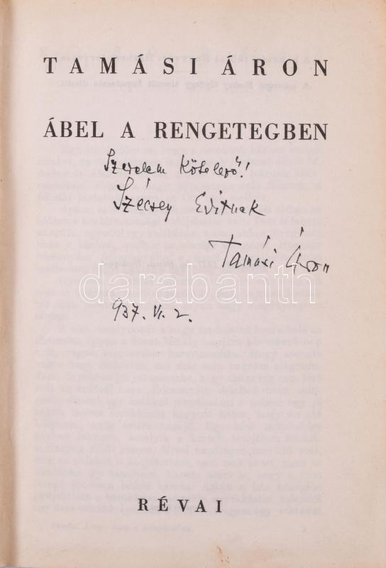 Tamási Áron: Ábel. Dedikált példány! Három rész egy kötetben. Ábel a rengetegben. Ábel az országban. Ábel Amerikában. A bekötési táblát Fenyves Sándor tervezte, a szöveget Buday György tizenöt fametszete díszíti. Budapest, 1937, Révai. 207p., 199p. 256p. Kiadói egészbőr-kötés, sérült gerinccel