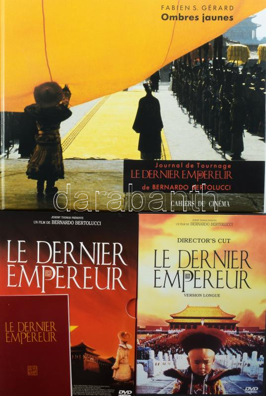 Gerard, Fabien S. : Ombres jaunes. Journal de Tournage Le Dernier Empereur de Bernardo Bertolucci. Paris, 1987, Cahiers du Cinéma, 187 p. Papírkötésben, számos színes és fekete-fehér képpel illusztrálva. Számozott (01429./600) kiadás. Francia nyelven. Hozzá tartozik 2 db DVD (angol nyelven, francia felirattal) + 1 db bónusz DVD (angol nyelven, francia felirattal), illetőleg egy számozott (03320./6000) filmkocka az eredeti filmtekercsből. A kiadvány Aranyozott, bársony díszdobozban. Ritka!
