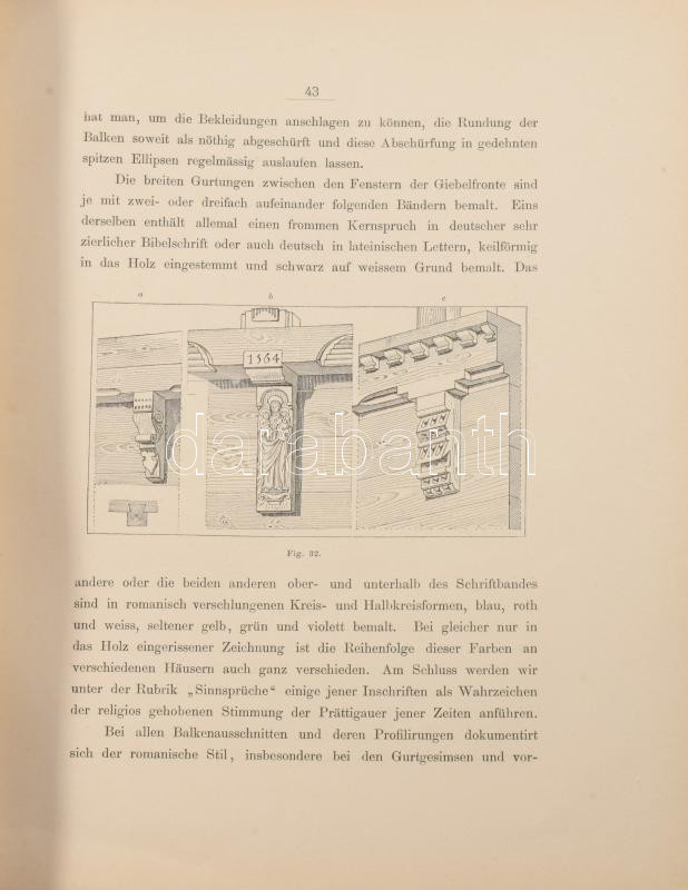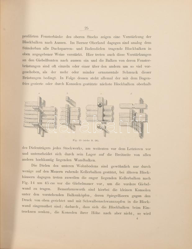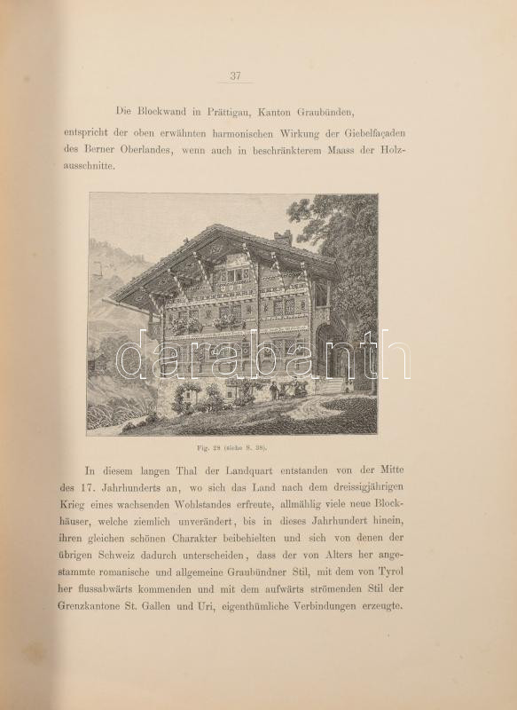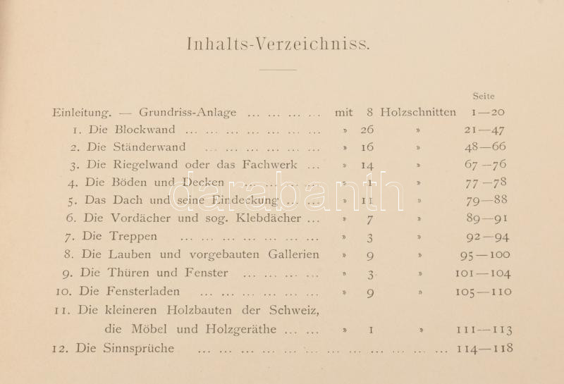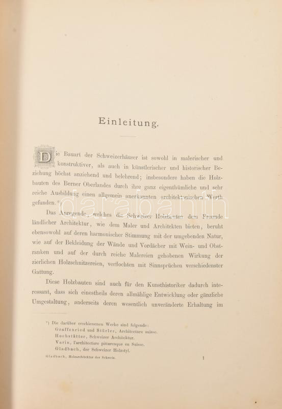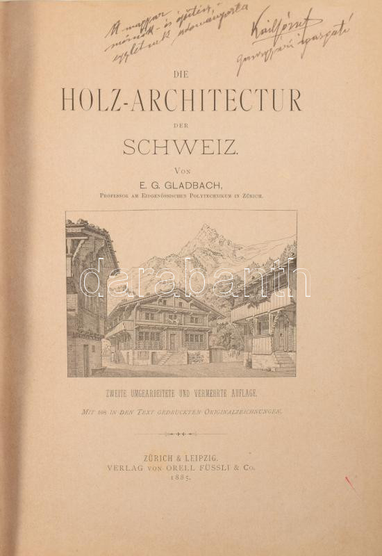 Gladbach, E. G.: Die Holz-Architectur der Schweiz Zweite umgearbeitete und vermehrte Auflage. Mit 108 in den Text gedruckten Originalzeichnungen. Zürich, Leipzig, 1885. Orell Füssli,, 118p. Gazdag képanyaggal, korabeli félvászon kötésben.