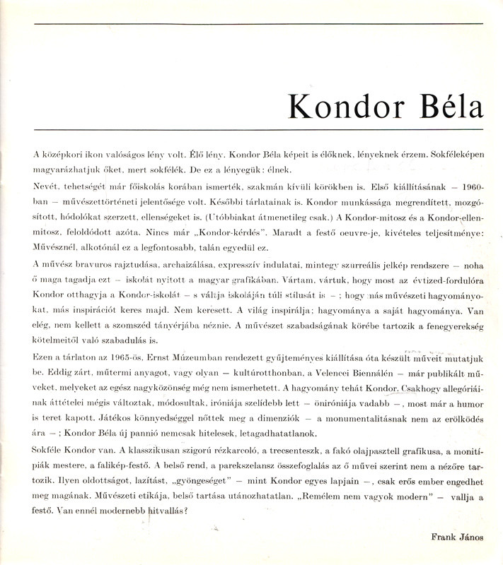 Kondor Béla (1931-1972) kétszeres Munkácsy-díjas festőművész, grafikus, író, költő. A Képzőművészeti Főiskolán Barcsay Jenő, Kmetty János és Koffán Károly tanítványa volt. A nemzetközi hírű festőművész jelentősebb önálló tárlatait 1960-tól láthatta a budapesti közönség. Az 1970. március 7-től 1970. április 5-éig látható Kondor-tárlatot Frank János rendezte, a kiállításon a művész legutóbbi évtizedében készült festmények szerepeltek. Kötetünk egész oldalas felvételeken Kondor Béla 19 festményének reprodukcióját közli.