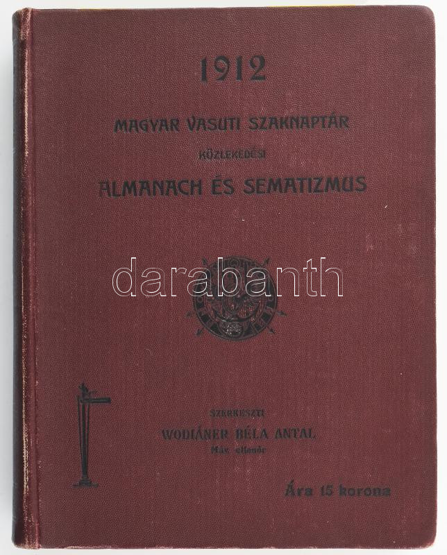 Magyar vasúti szaknaptár. Közlekedési almanach és sematizmus. 1912. XI. évf. Szerk.: Wodiáner Béla Antal. Bp.,1912., Wodianer F. és Fiai, XXXII p.+1 (bessenyei Beöthy László kereskedelemügyi m. kir. miniszter) t. +2+160+664 p. + 4 (fejezet címlapok) t. Rendkívül izgalmas korabeli reklámanyaggal. Kiadói egészvászon-kötés, Gottermayer-kötés, kissé kopott borítóval. Ritka!