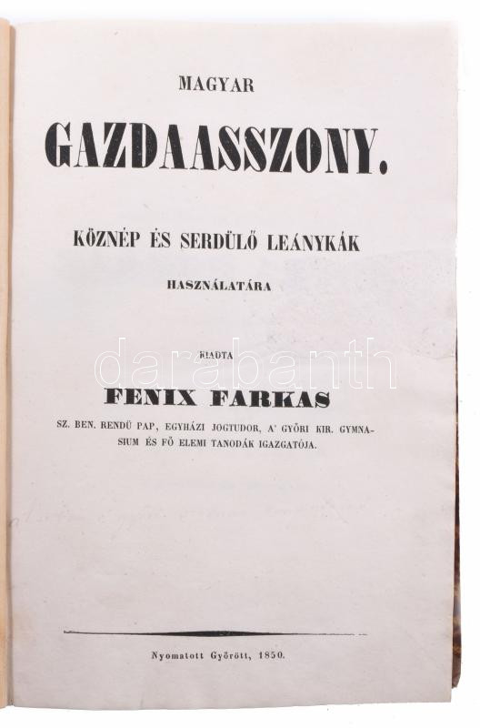 Fenix Farkas: Magyar gazdaasszony. Köznép és serdülő leánykák használatára Győrött, 1850. ny. n. 211 + [5] p. Egyetlen kiadás. A kötet az alapvető főzési alapanyagok mellet háztartási, gazdasági praktikákat ismertet. BOEH III, 2929. Hozzákötve: Fenix Farkas: Természetrajz. Gazdálkodást kedvelő köznép és serdülő ifjuság használatára Győr, 1850. [Streibig Klára.] [2] + 276 + [3] p. Korabeli aranyozott gerincű egészvászon kötésben. Ritka!