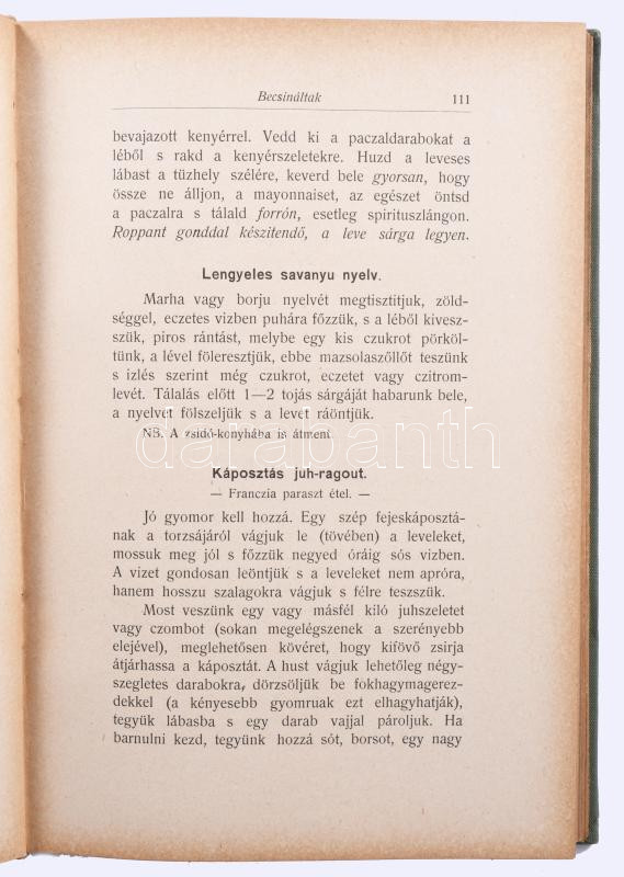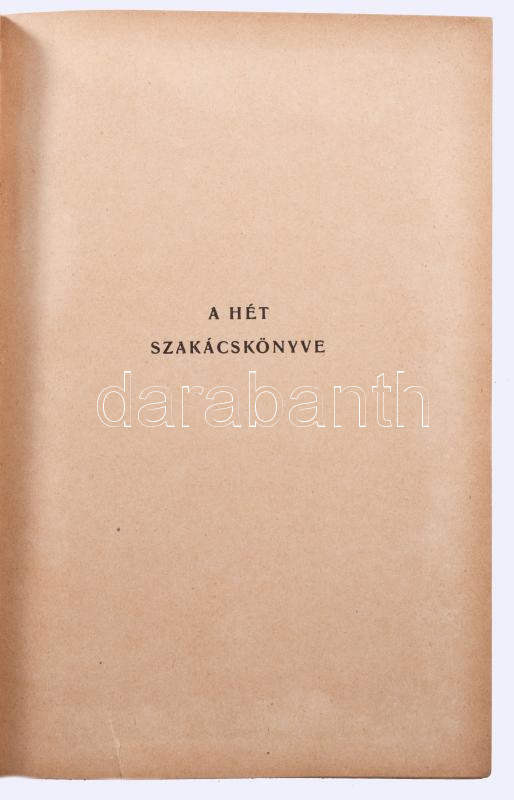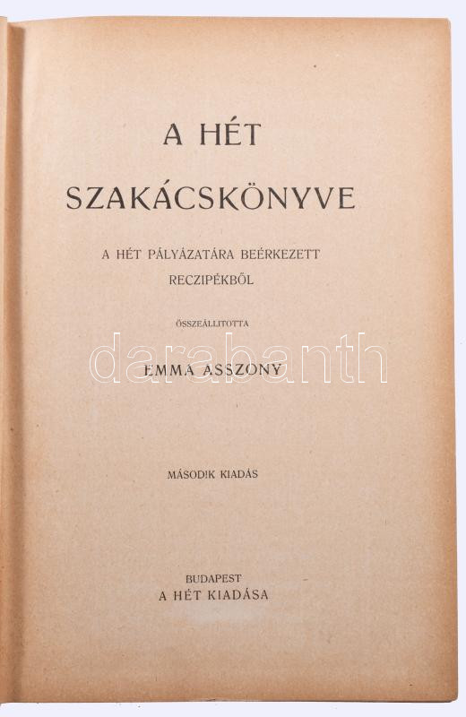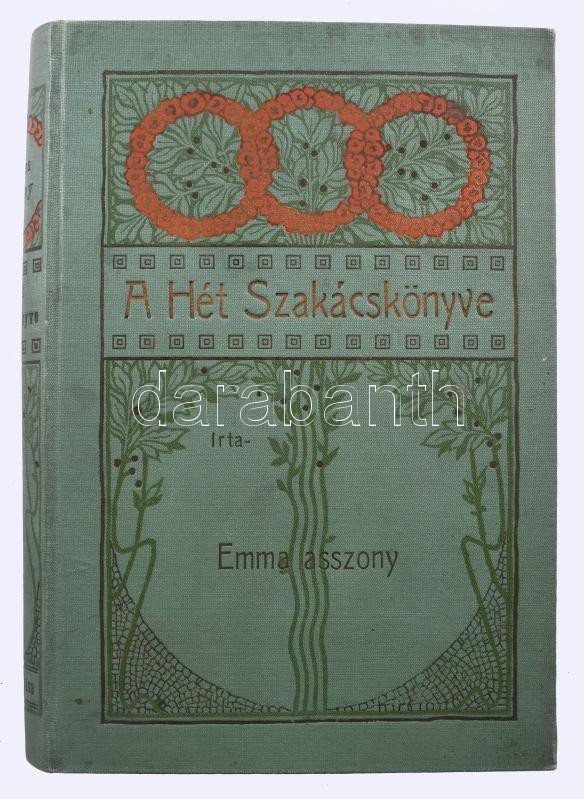 [Ignotus (Veigelsberg Hugó)] Emma asszony: A Hét Szakácskönyve. A Hét pályázatára beérkezett reczipékből összeállította - -. 2. kiadás. Bp., 1908, A Hét. (Révai és Salamon ny.). 358,[9] p. A szerző (1869-1949) 1891-től A Hét című folyóiratnál dolgozott, majd 1908-tól a Nyugat szerkesztője lett. Kiadói, (Dörner és Heimberg Kötészet) festett, aranyozott egészvászon kötésben. Szép példány. H.D.: 706.