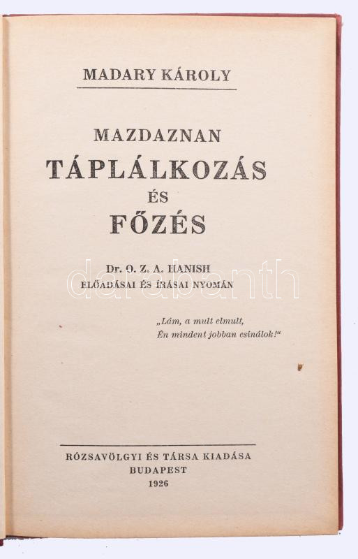 Madary Károly: Mazdaznan táplálkozás és főzés. Dr. O. Z. A. Hanish előadásai és írásai nyomán. Bp., 1926. Rózsavölgyi. 111 l.