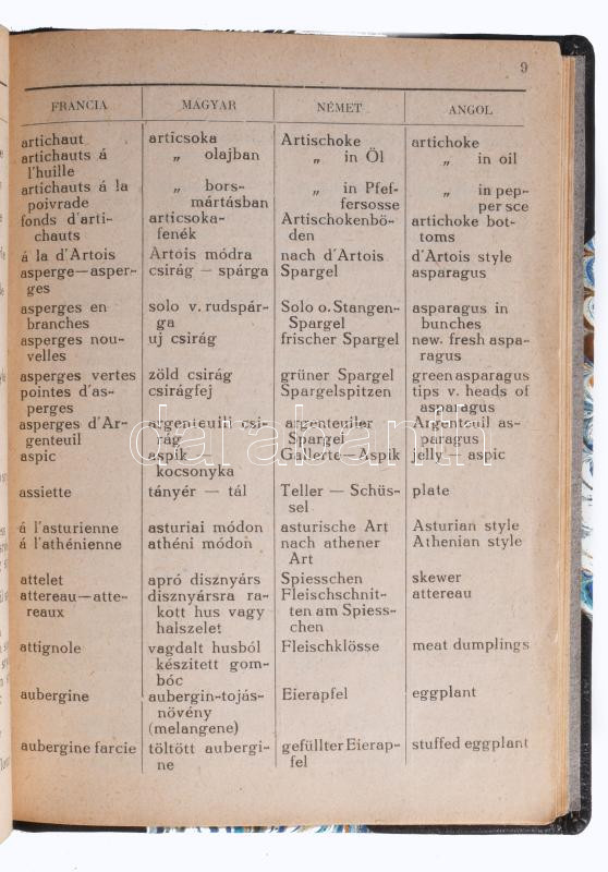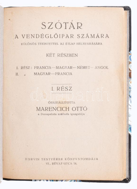 Marencich Ottó: Szótár a vendéglőipar számára. Különös tekintettel az étlap helyesírására 1-2. rész 1. Francia-magyar-német-angol 2. Konyhaszótár magyar-francia (Bp., 1923.), Korvin testvérek. 189 l. Későbbi félbőr kötésben. Jó állapotban. Ritka