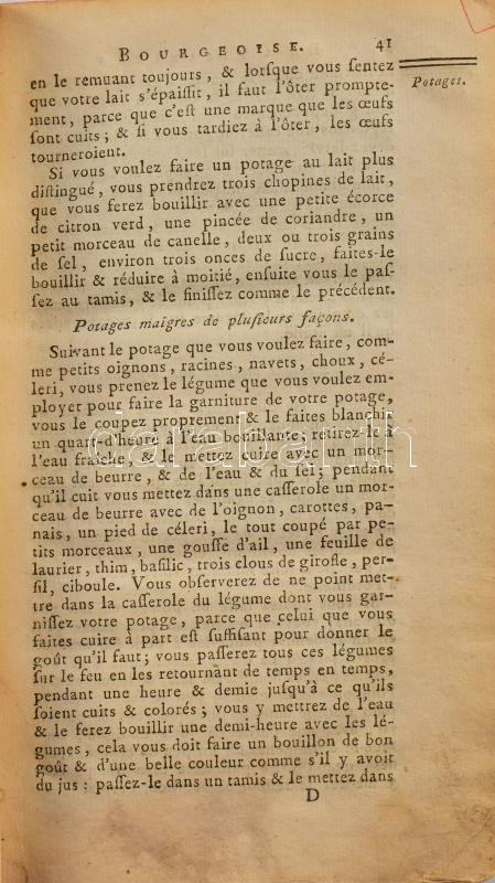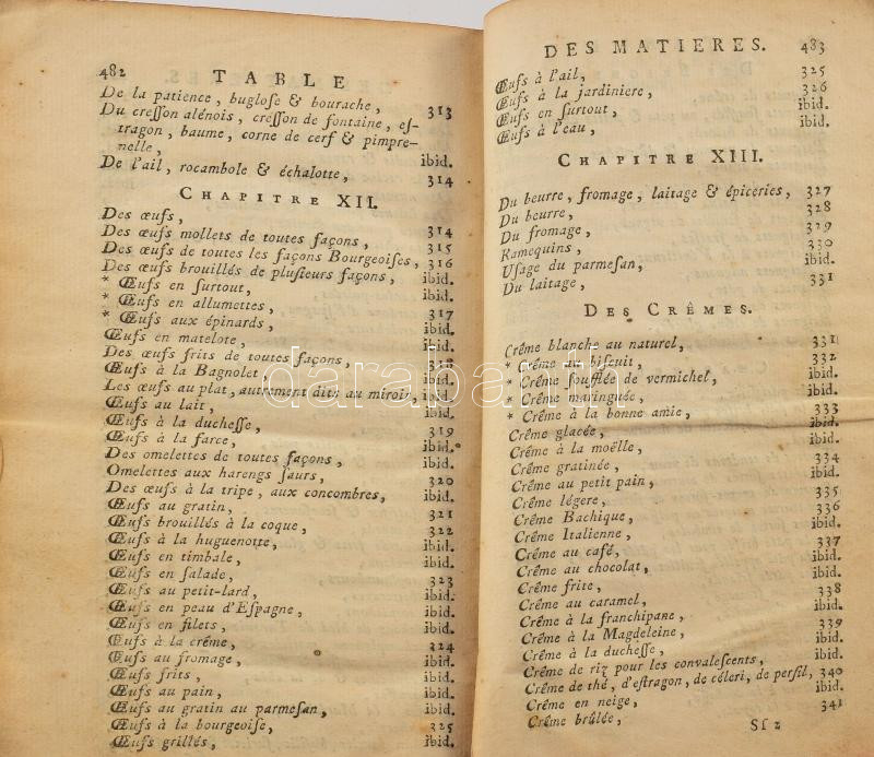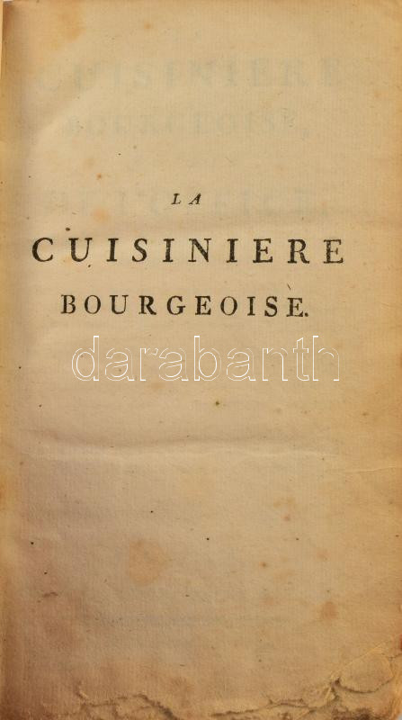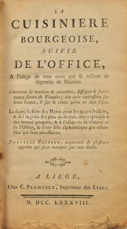 [Menon, Joseph (1700?-1771)]: La Cuisiniere Bourgeoise, suivie de L'Office a l'usage de tous ceux qui se mélent de dépenses de Maisons. Liege, 1788., C. Plomteux, 492 p. Francia nyelven. Nouvelle Édition. Korabeli aranyozott gerincű egészbőr-kötés, kopott borítóval, sérült gerinccel, foltos lapokkal, a lapok egy részének alján (összesen kb. 15 lap) szöveget nem érintő sérülésekkel.