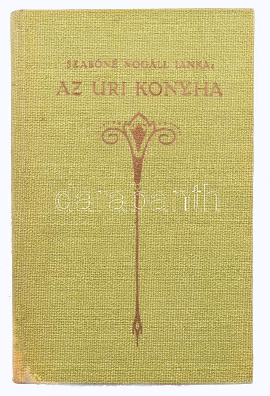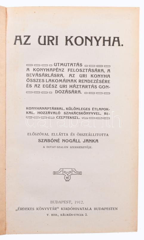 Szabóné Nogall Janka: Az uri konyha. Utmutatás a konyhapénz felosztására, a bevásárlásra, az uri konyha összes lakomáinak rendezésére és az egész uri háztartás gondozására. Konyhanaptárral, különleges étlapokkal, hozzávaló szakácskönyvvel, reczeptekkel. Bp., 1912. Érdekes Könyvtár Kiadóhivatala. (Pallas ny.). 160p. Kiadói, aranyozott egészvászon-kötésben, a gerinc alján folttal. Szép állapotban. Ritka H.D.: 1623.