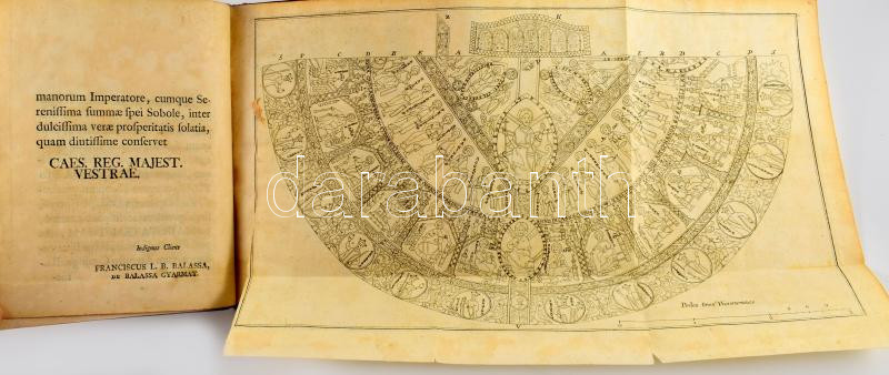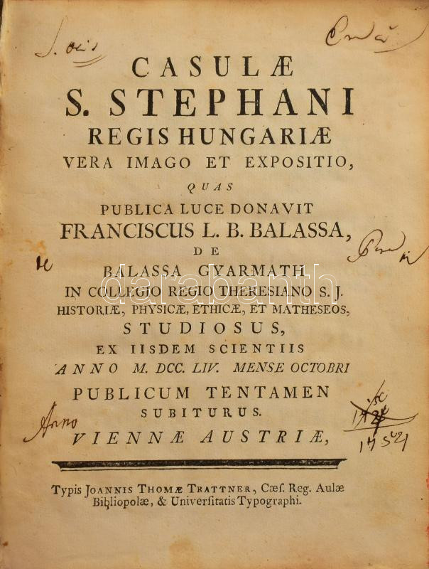 Balassa [Ferenc], Franciscus: Casulae S. Stephani regis Hungariae vera imago et expositio, quas publica luce donavit Franciscus Balassa, de Balassa Gyarmath in collegio regio Theresiano S. J. historiae, physicae, ethicae, et matheseos, studiosus, ex iisdem scientiis anno M. DCC. LIV. mense Octobri publicum tentamen subiturus. Viennae Austriae [Bécs], 1754.,Typis Joannis Thomae Trattner, 12+ 58+32 p. + 1 (a királyi palástot ábrázoló, kihajtható rézmetszet, szakadt) t. Egyetlen kiadás. Latin nyelven. Korabeli aranyozott egészbőr-kötés, "L. B. E. P. 1756" felirattal a borítón", kopott borítóval, kissé sérült gerinccel, possessori bejegyzésekkel (hátsó szennylapon Móra Gábor 1936), a címlapon bejegyzésekkel, foltos szennylapokkal és előzéklapokkal, szakadt metszettel.