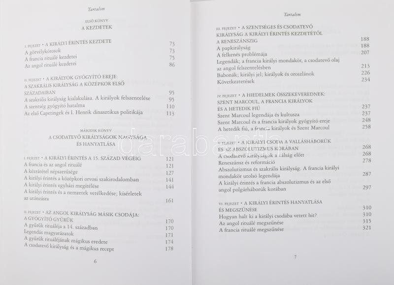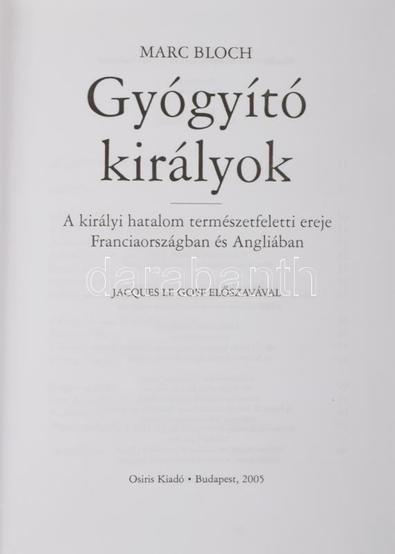 Bloch, Marc: Gyógyító királyok. A királyi hatalom természetfeletti ereje Franciaországban és Angliában. Jacques Le Goff előszavával. Ford.: Haas Lídia. Bp., 2005, Osiris, 568 p. Egyetlen magyar kiadás. Kiadói kartonált papírkötés, a sarkain apró kopásnyomokkal, jó állapotban.