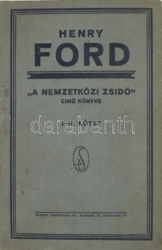 Ford, Henry: "A nemzetközi zsidó" című könyve. Bp.,1926, Stádium, 246;+ [247]-451+5 p. 1., magyar nyelvű kiadás! Javított gerincű és kötésű kiadói egészvászon-kötésben, kissé kopott borítóval.