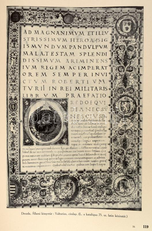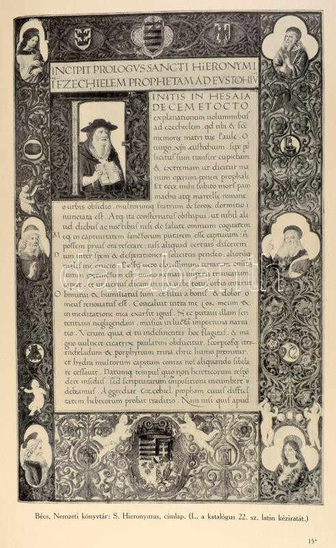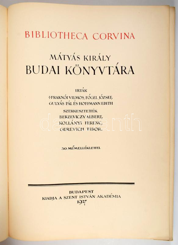 Fraknói Vilmos - Fógel József - Gulyás Pál - Hoffmann Edith: Bibliotheca Corvina. Mátyás király budai könyvtára. Bp., 1927, Szent István Akadémia, 171 p. Számozott (94./200) példány. Egészoldalas, fekete-fehér és színes képekkel illusztrálva. Kiadói papírkötésben, gerincen kis sérüléssel