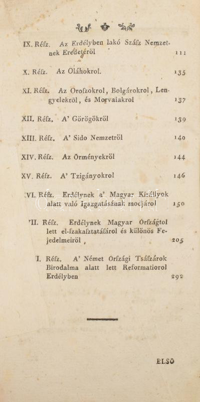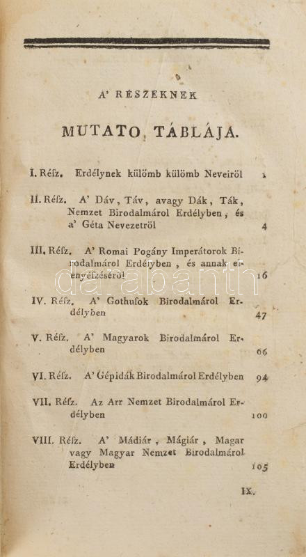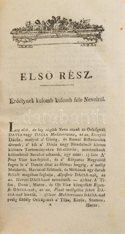 Huszti András: Ó és újj Dácia, az az Erdélynek régi és mostani állapotjárol való história, ... , mellyet mutato táblával meg-bövitvén, a'maga költségén ki-adott Diénes Sámuel. Bétsben, 1791, Dienes Sámuel, 4 sztl. lev. + 294 + 17 sztl. lev. Átkötött, dekoratív modern félbőr-kötésben, restaurált, régi bélyegzésekkel, és régi bejegyzésekkel.