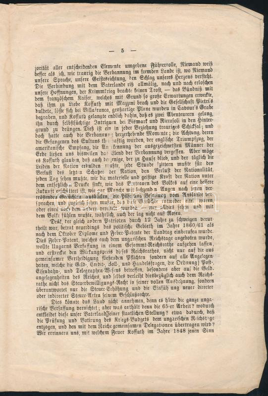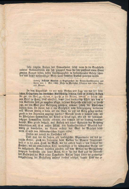 Pulszky, [Ferenc] Franz: Antwort auf Ludwig Kossuth's offenen Brief an Franz Deák. Pest, 1867, Gyurian und Gebrüder Deutsch-ny., 8 p. Német nyelven. Fűzés nélkül, kissé foltos, középen hajtásnyommal.