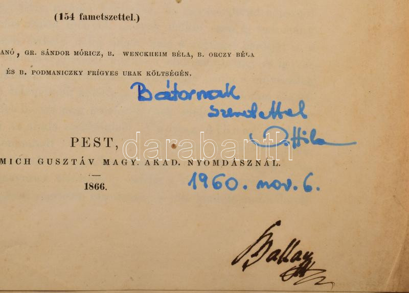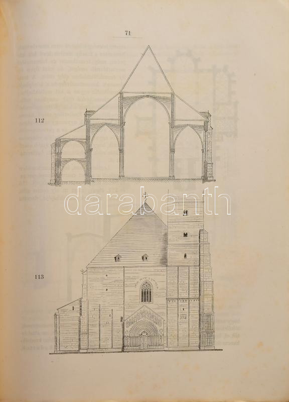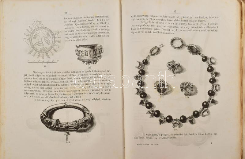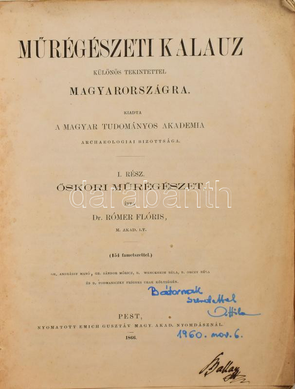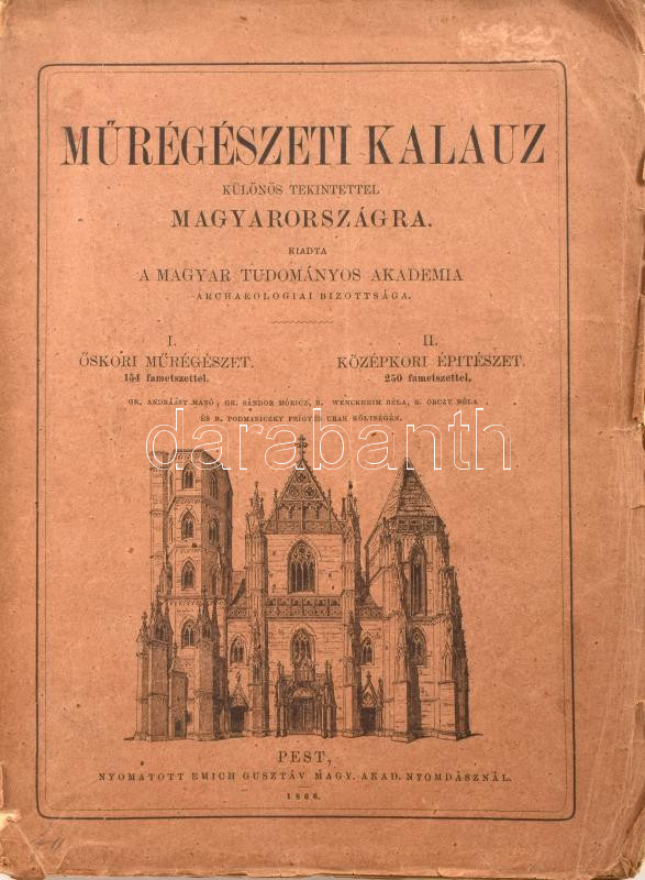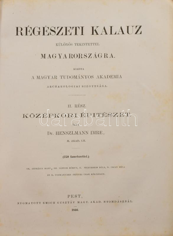Rómer Flóris - Henszlmann Imre: Műrégészeti kalauz, különös tekintettel Magyarországra. Őskori műrégészet. Középkori építészet. I-II. kötet. (Egy kötetben.) [Unicus, több része nem jelent meg.] Pest, 1866., Magyar Tudományos Akadémia, (Emich Gusztáv-ny.), V+3+134+2;+2+150 p. Első kiadás. Szövegközti fametszetekkel: ábrákkal, rajzokkal, keresztmetszeti és homlokzati rajzokkal gazdagon illusztrált. Kiadói illusztrált papírkötés, a borítón fametszetű illusztrációkkal, szakadt borítóval, a borítón kis gyűrődésekkel, két kijáró lappal (131/132.,134/135.), kissé foxing foltos lapokkal, a címlapon modern ajándékozási sorokkal, valamint régi, talán egykorú névbejegyzéssel (Ballay.)