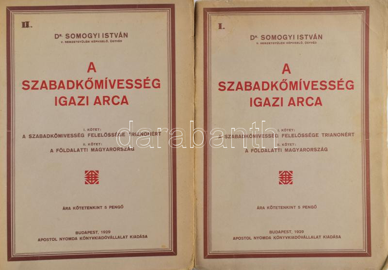 Somogyi István: A szabadkőmívesség igazi arca. I-II. köt. I. köt.: A szabadkőmívesség felelőssége Trianonért. II. köt. A földalatti Magyarország. Bp., 1929, Apostol Nyomda, 183 p.; 211+1 p. Első kiadás. A mű szerepel az Ideiglenes Nemzeti Kormány által 1945-ben kiadott, tiltott könyvek listáján. Kiadói papírkötések, kissé foltos, kissé kopott borítókkal. Ritka!