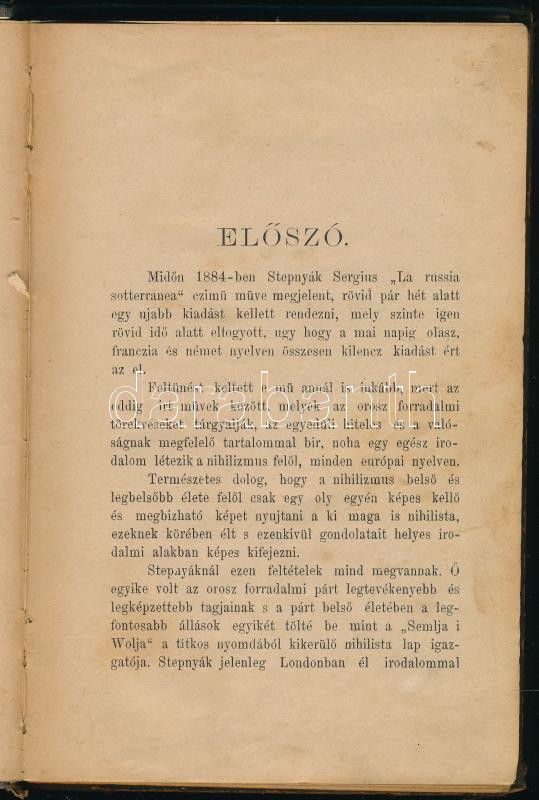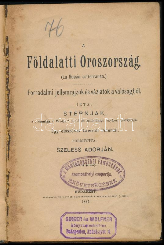 Steonjak [Stepnâk-Kravcinskij, Sergej Mihajlovic (1851-1895)]: A földalatti Oroszország. Forradalmi jellemrajzok és vázlatok a valóságból. Írta: - -. Egy előszóval Lawroff Pétertől. Ford. Szeless Adorján. Budapest, 1887. Schlenker - Kovács Ny. 4 sztl. lev. 222 l. A kötet az orosz nihilista forradalmi törekvéseket ismerteti belülről, lévén a szerző is nihilista. A fordító célja az anarchista eszmék bemutatásával éppen az, hogy a hazánkban kibontakozó pánszláv terjeszkedést letörje. Korabeli félvászon kötésben, intézményi bélyegzőkkel, néhány foltos lappal. Ritka!