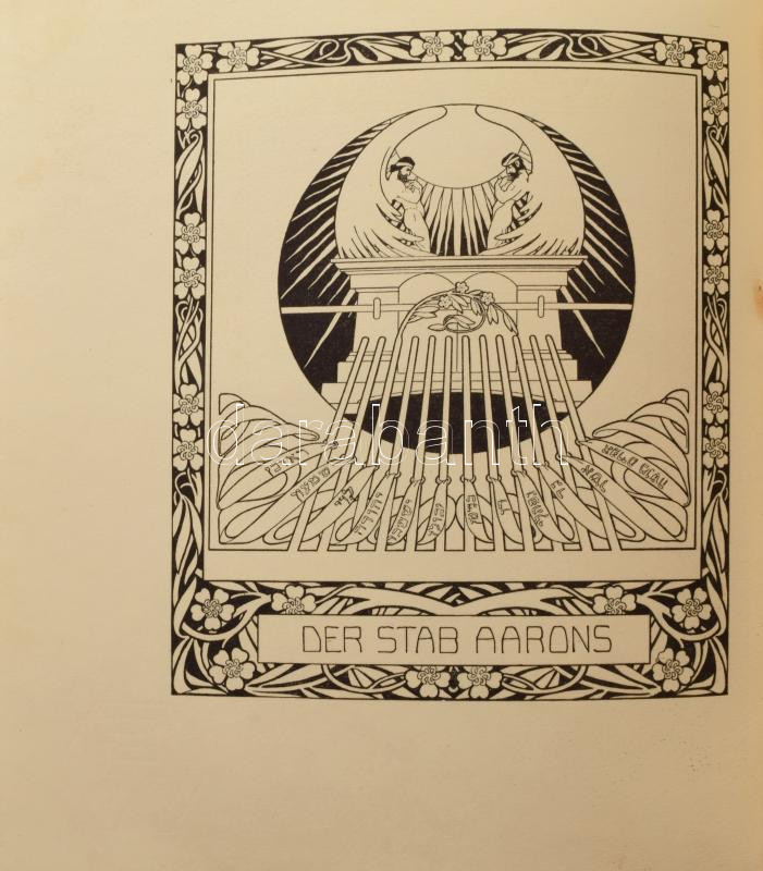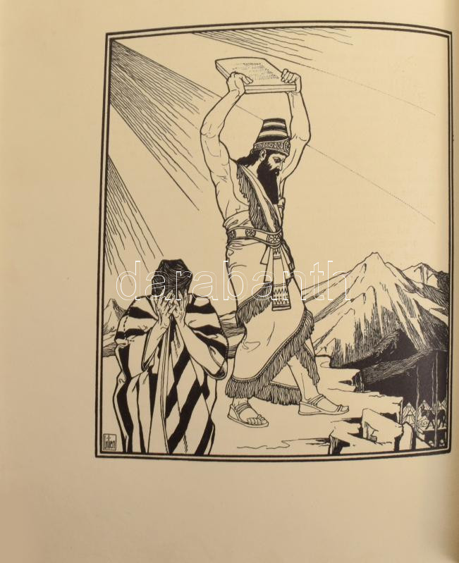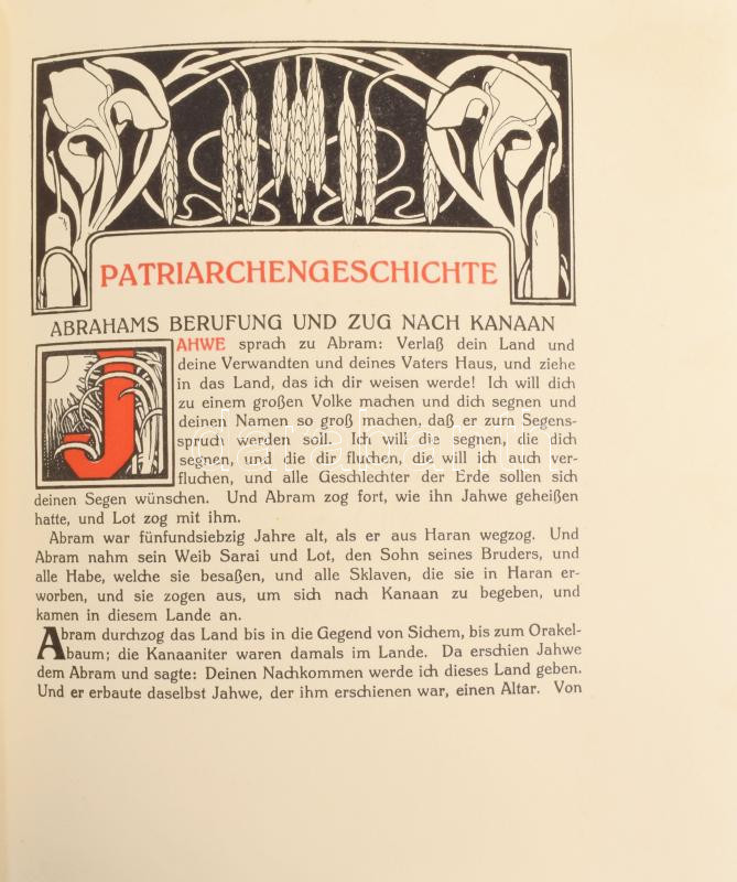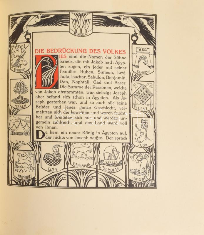 Die Bücher der Bibel: Überlieferung und Gesetz. Das Fünfbuch Mose und das Buch Josua nach des Übersetzung von Reuss. Hrsg. von F. Rahlwes. Zeichnungen von E[phraim] M[oses] Lilien. Band 1. Braunschweig, 1908, George Westermann, 552 p., ill (rézben színes.) E. M. Lilien szecessziós könyvillusztrációival és könyvdíszeivel rendkívül gazdagon illusztrált. Számozott, 28. számú: Maurycy "Ephraim Moses" Lilien (1874-1925) lengyel-zsidó szecessziós könyvillusztrátor, grafikus, az "első cionista művész" által ALÁÍRT példány.