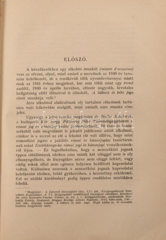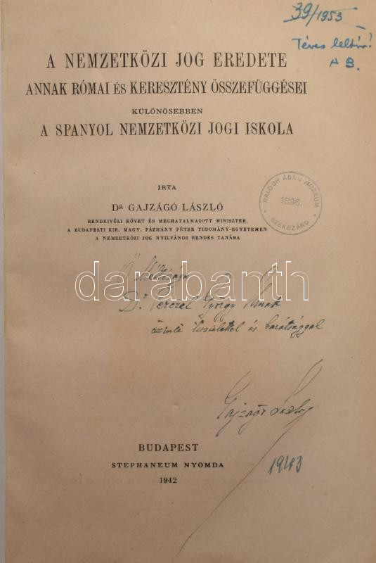 Dr. Gajzágó László: A nemzetközi jog eredete, annak római és keresztény összefüggései. Különösebben a spanyol nemzetközi jogi iskola. Dedikált Bp., 1942, Stephaneum, XI+433 p. Modern, aranyozott gerincű egészvászon kötésben