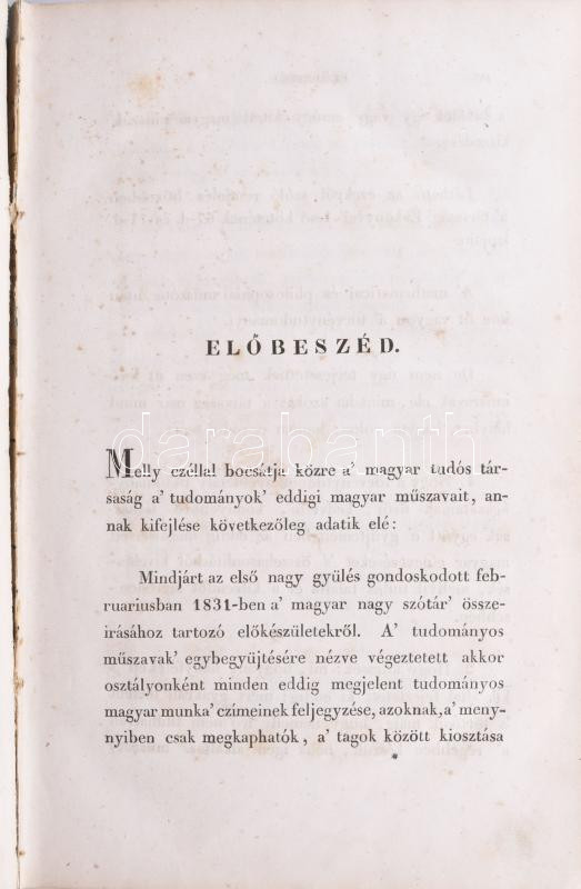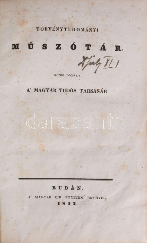 Törvénytudományi műszótár. Előbeszédet írta D. Schedel Ferencz, titoknok. Toldy Ferenc /születéskori neve Schedel Ferenc/ (Buda, 1805. augusztus 10. - Budapest, 1875. december 10.) irodalomtörténész, kritikus, egyetemi tanár, a Magyar Tudományos Akadémia tagja, titkára, a Kisfaludy Társaság másodelnöke, Toldy István író, újságíró és Toldy László fővárosi főlevéltárnok apja. XII + 444 p