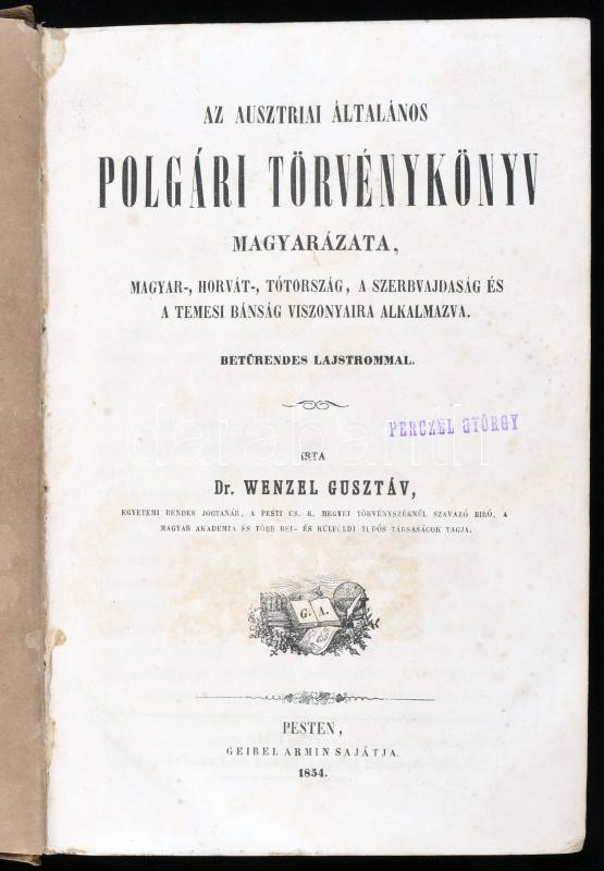 Wenzel Gusztáv: Az ausztriai általános polgári törvénykönyv magyarázata, Magyar-, Horvát-, Tótország, a Szerbvajdaság és a Temesei bánság viszonyaira alkalmazva. Betűrendes lajstrommal. Pesten, 1854. Geibel Ármin. XII, 820 l. Utolsó néhány lap sarkán foltokkal. Korabeli aranyozott gerincű egészvászon kötésben. Ritka!