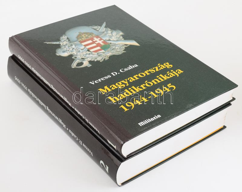 Veress D. Csaba: Magyarország hadikrónikája 1944-1945. 1-2. köt. 1.: A kárpáti harcoktól a Dunántúl elleni szovjet támadásig. (1944. augusztus 25. - 1944. november 6.) 2.: A Dunántúl elleni szovjet támadástól a német Birodalmi Védőállás áttöréséig. (1944. november 7. - 1945. április 13.) Dedikált! Bp., 2002-2003, Történelmi Hagyományőrző és Hadisírgondozó Alapítvány, 477+(3) p.; 485-1173 p.+ (3) p. Fekete-fehér fotókkal illusztrálva. Kiadói kartonált papírkötés. Az első kötet címlapján a szerző, Veress D. Csaba (1933-2014) történész dedikációjával.