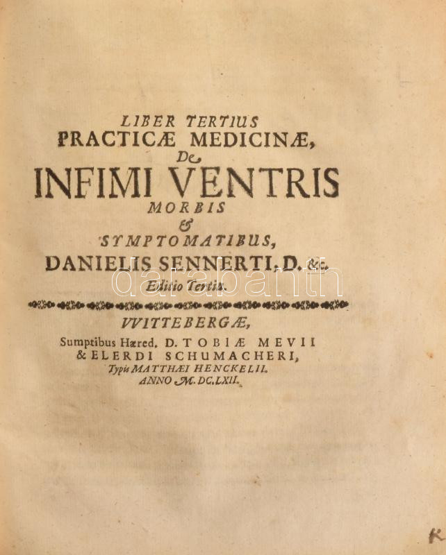 Liber Tertius [III.]: Practicae Medicinae, De Infimi Venetris Morbis & Symptomatibus, Danielis Sennerti, D. & c. Editio Tertia. [1662].;