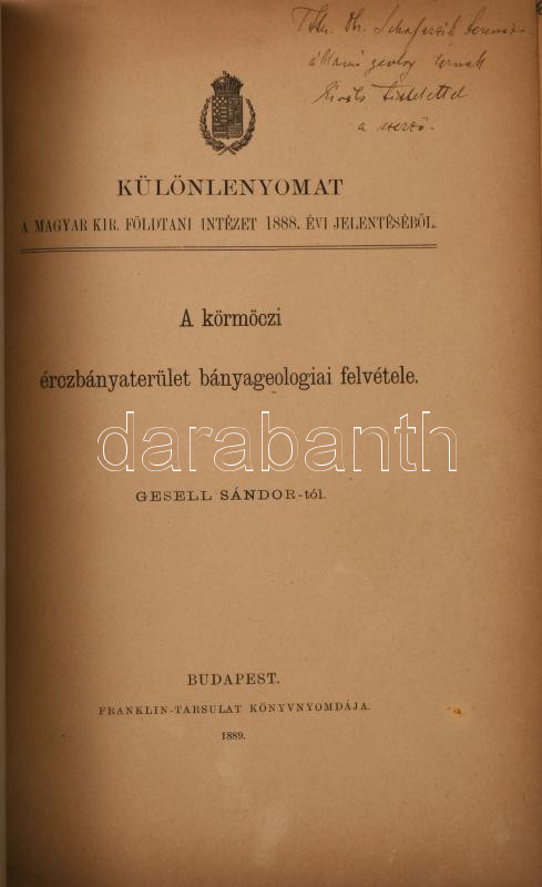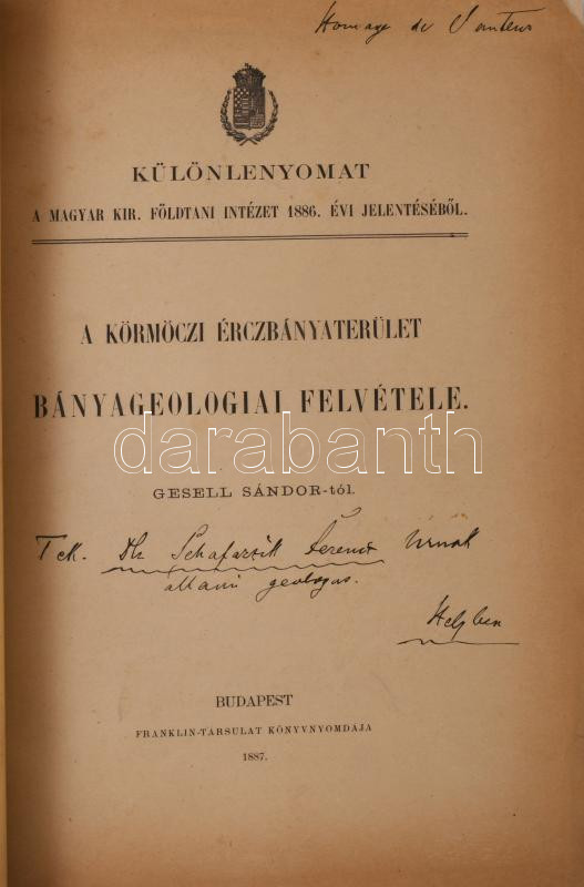 Gesell Sándor kolligátum, 5 művéből. Mind a szerző, terebesfejérpataki Gesell Sándor (1839-1919) kir. főbányatanácsos és bányafőgeológus, a Magyar Királyi Földtani Intézet munkatársa által Schafarzik Ferenc (1854-1927) geológus, műegyetemi tanár, a Magyar Királyi Földtani Intézet munkatársa, a műszaki földtan, földrengéstan és hidrogeológia egyik hazai úttörője részére DEDIKÁLT példány!